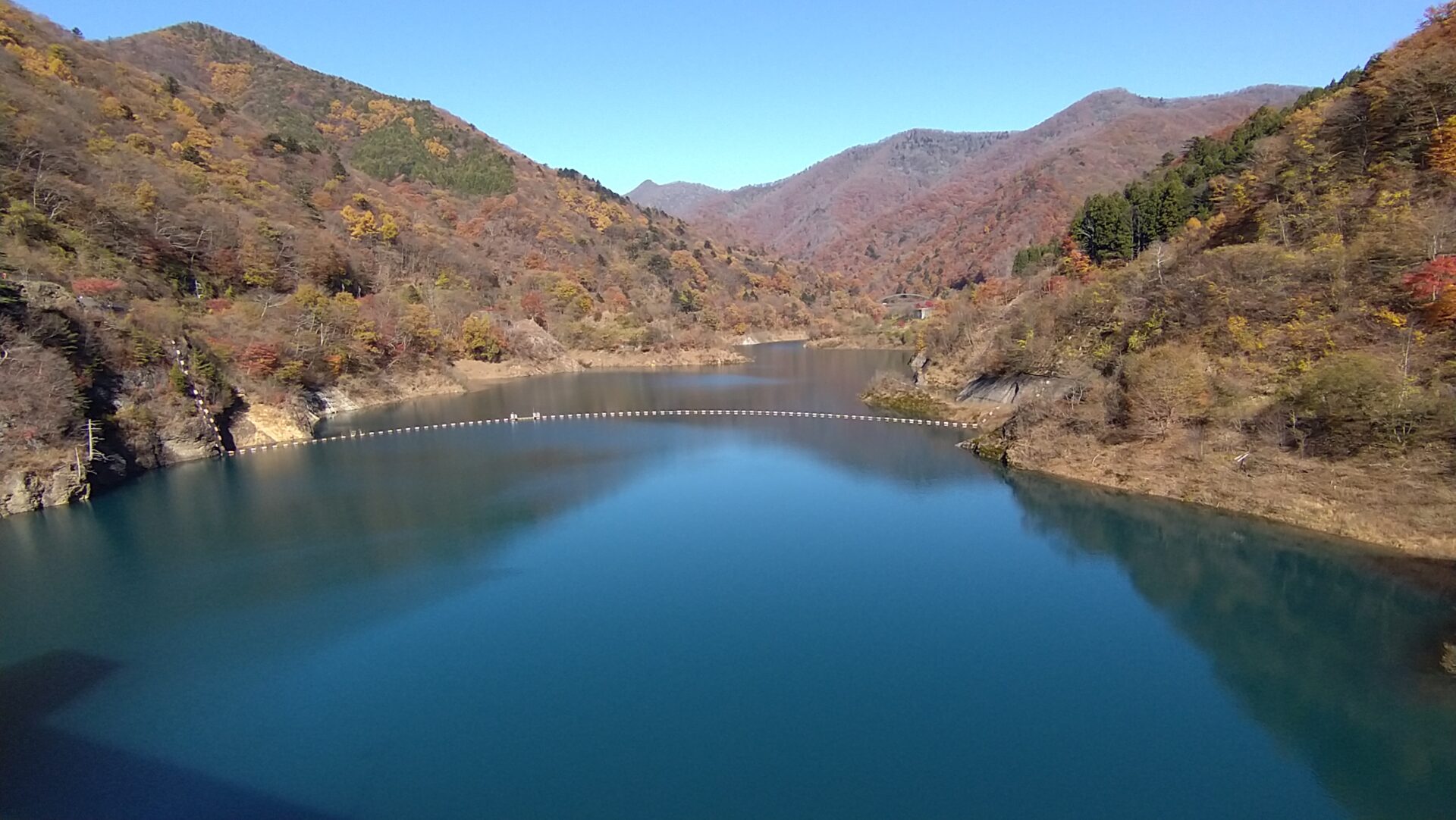 こちらはダム湖の様子で、名前は「奥四万湖」。ダム湖の水は鮮やかなブルーで、「四万ブルー」と呼ばれています。