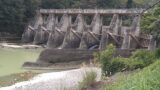 こちらは、上流側から見た様子。洪水吐は5門のローラーゲートと、その左には細いゲートが見えます。右岸寄りにも2門のゲートがあり、発電用のゲートと思われますね。