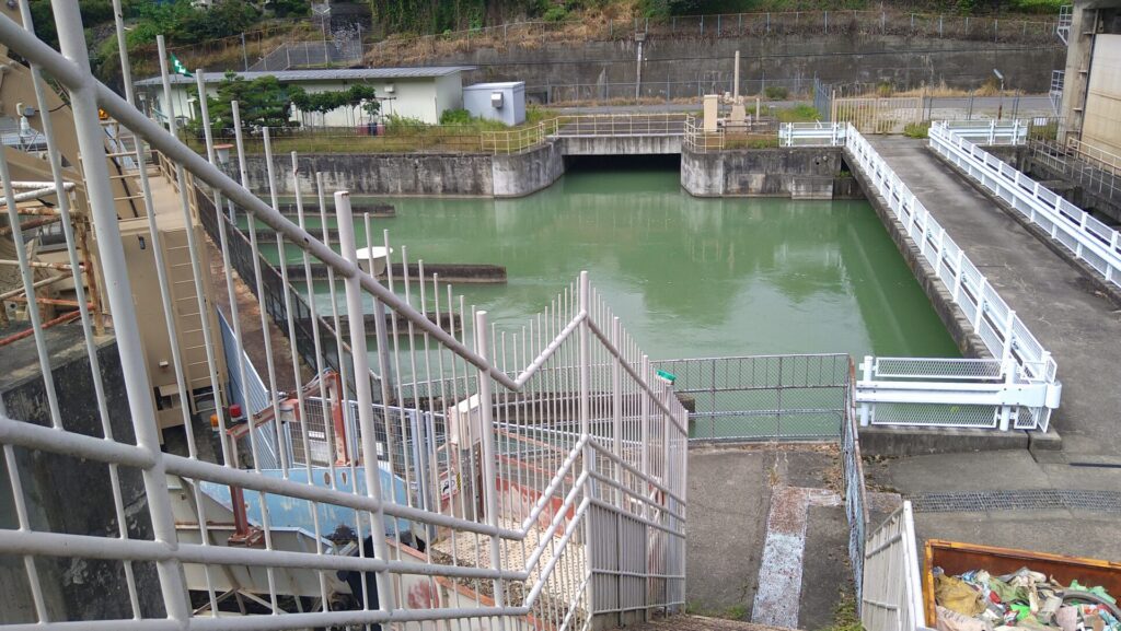 正面に見える、流入口の付近を通路が通ってます。