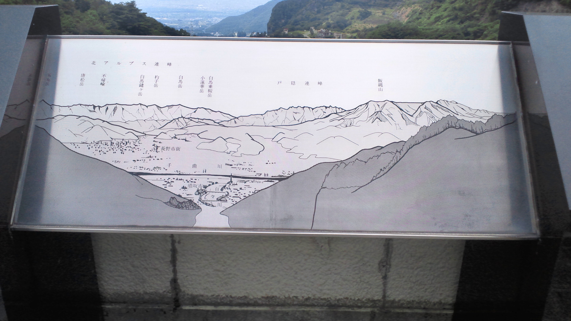 天端からは須坂市の街並みと、その先には北アルプス連峰や戸隠連峰の山々が見えるようです。しかしながら、訪れた日は雲が多く、山々まではよく見えませんでした。