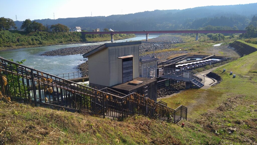 右岸には魚道があり、折り返す構造になっています。なんとなく、某サーキットのヘアピンカーブを連想してしまいました。